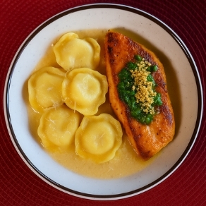 Uma combinação surpreendente de sabores: ravioli artesanal de banana-da-terra com toque adocicado, servido ao lado de salmão grelhado no ponto certo, finalizado com pesto de coentro e farofa crocante de panko.