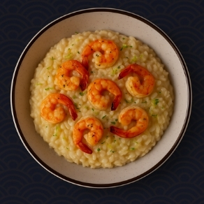 Risoto cremoso com camarões suculentos e o frescor das raspas de limão siciliano, em um prato que equilibra sabor e elegância.