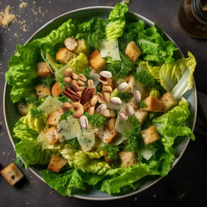 Salada fresca e equilibrada, com folhas selecionadas, crocância das castanhas e croutons, dulçor das frutas tropicais e o toque marcante do parmesão em lascas.